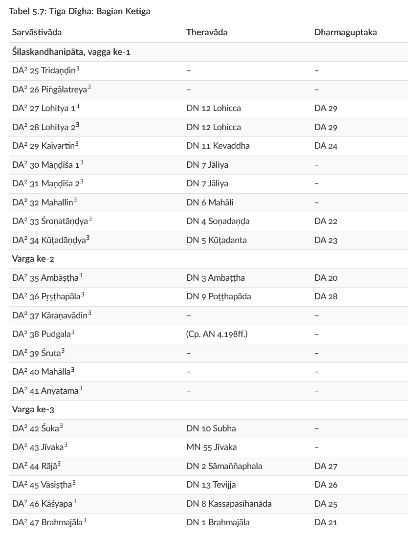 - Tiga Dīgha berbagi banyak khotbah yang sama, tetapi urutan dan organisasi dari khotbah-khotbah itu sangat berbeda.